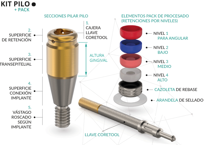 La unión entre el pilar Pilo y la estructura protésica se realiza mediante el pack de procesado.