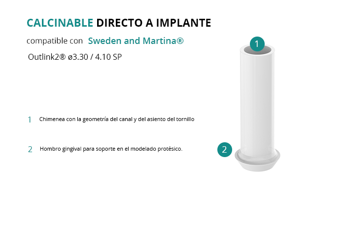 El calcinable directo a implante es ideal para la creación de pilares personalizados y estructuras atornilladas, asegurando un ajuste fiable y de calidad en restauraciones sobre implantes de la plataforma Outlink2® Ø3.30 / 4.10 SP de Sweden and Martina®.