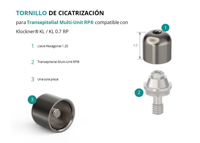 GT-Medical ofrece un Tornillo de Cicatrización para el Transepitelial Multi-Unit® RP (tipo Nobel®) compatible con la línea de implantes KL / KL 0.7 RP de la marca Klockner®, está fabricado en Titanio Grado 5, tiene un diámetro de 4.8mm, y una altura total de 4.6mm.